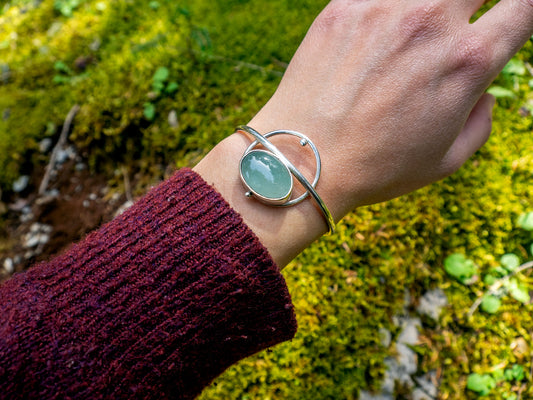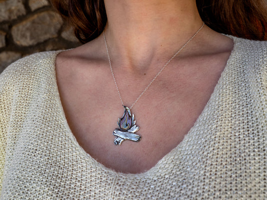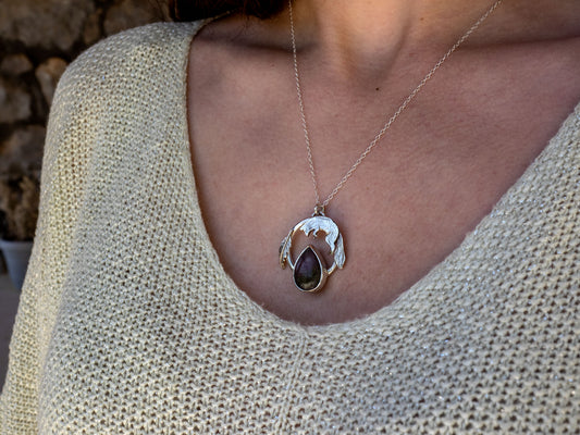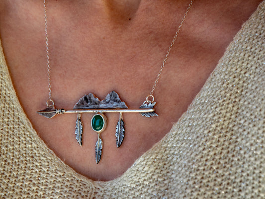 Mixed metal necklace with a Tourmaline stone and a mountain scene