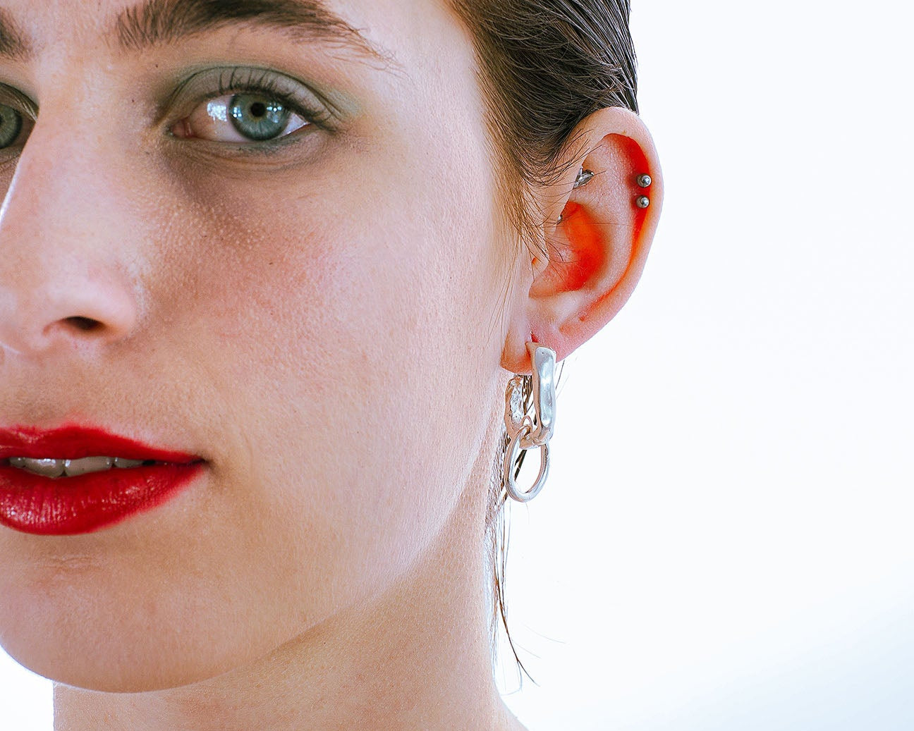 Αυτά τα κινητικά σκουλαρίκια κρίκοι, κατασκευασμένα από ασήμι 925, συνδυάζουν τον μοντέρνο μινιμαλισμό με τη δυναμική κίνηση. Διαθέτοντας έναν μικρότερο κρίκο που αιωρείται κάτω από τον κύριο κρίκο, δημιουργούν ένα ρευστό, ακατέργαστο σχέδιο που αποτυπώνει την ουσία του σύγχρονου σχεδιασμού και του αβίαστου στυλ.