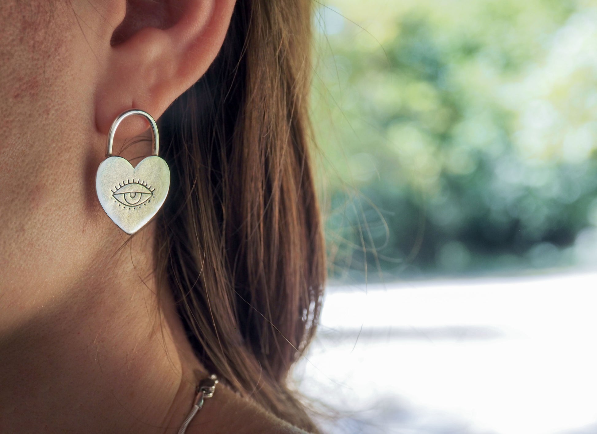 Symbolic stud earrings made with Silver 925 featuring a heart padlock and at the center of the heart, a finely engraved eye that adds a unique and meaningful detail, a symbol of protection and intuition.