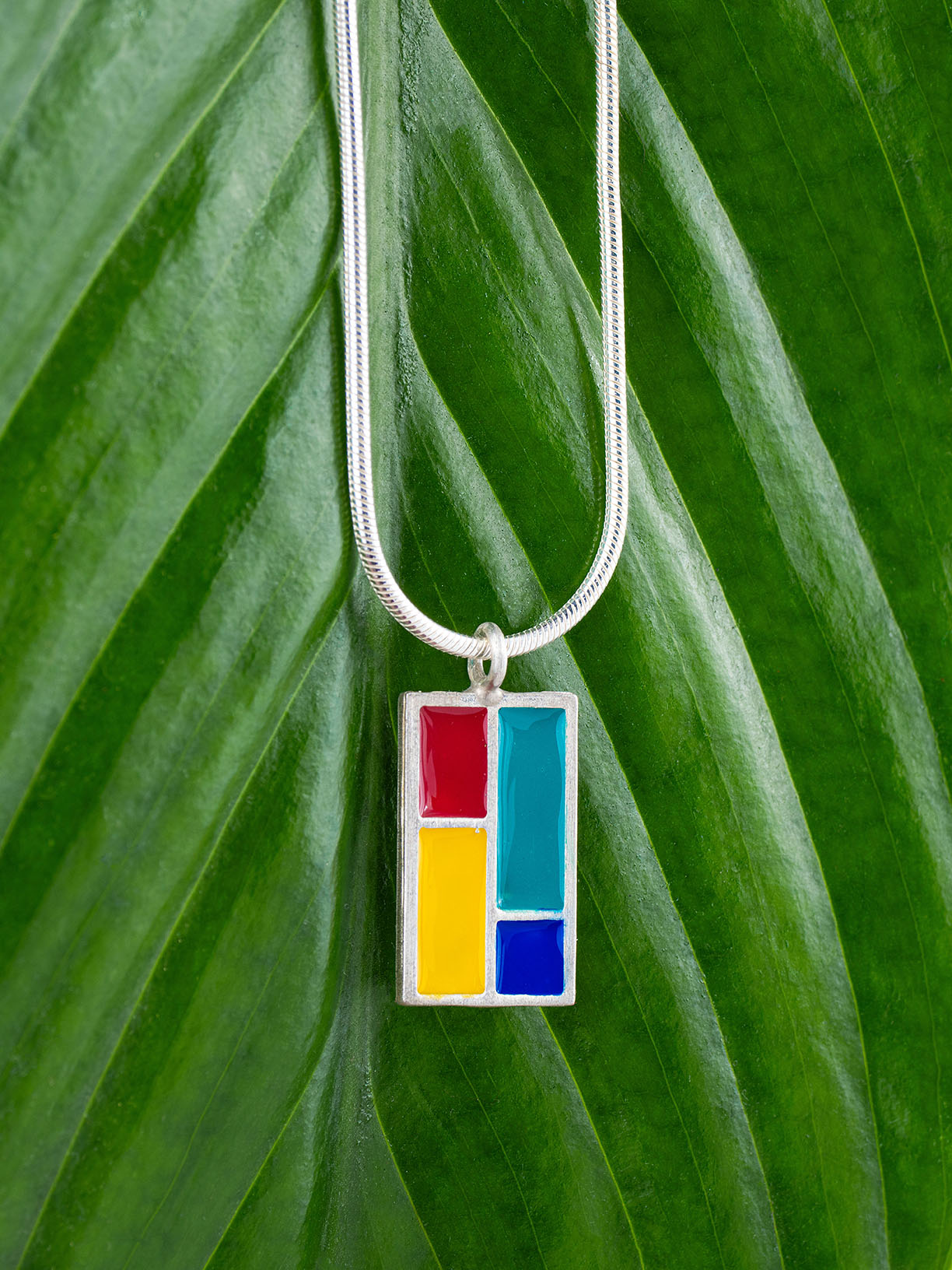 A handcrafted silver 925 pendant inspired by geometric composition and the interplay of color. Enriched with enamel in bold, contrasting tones, the rectangular form resembles a modern abstract canvas, where color becomes structure and geometry becomes expression. A contemporary statement piece that celebrates balance, rhythm and individuality through color and form.