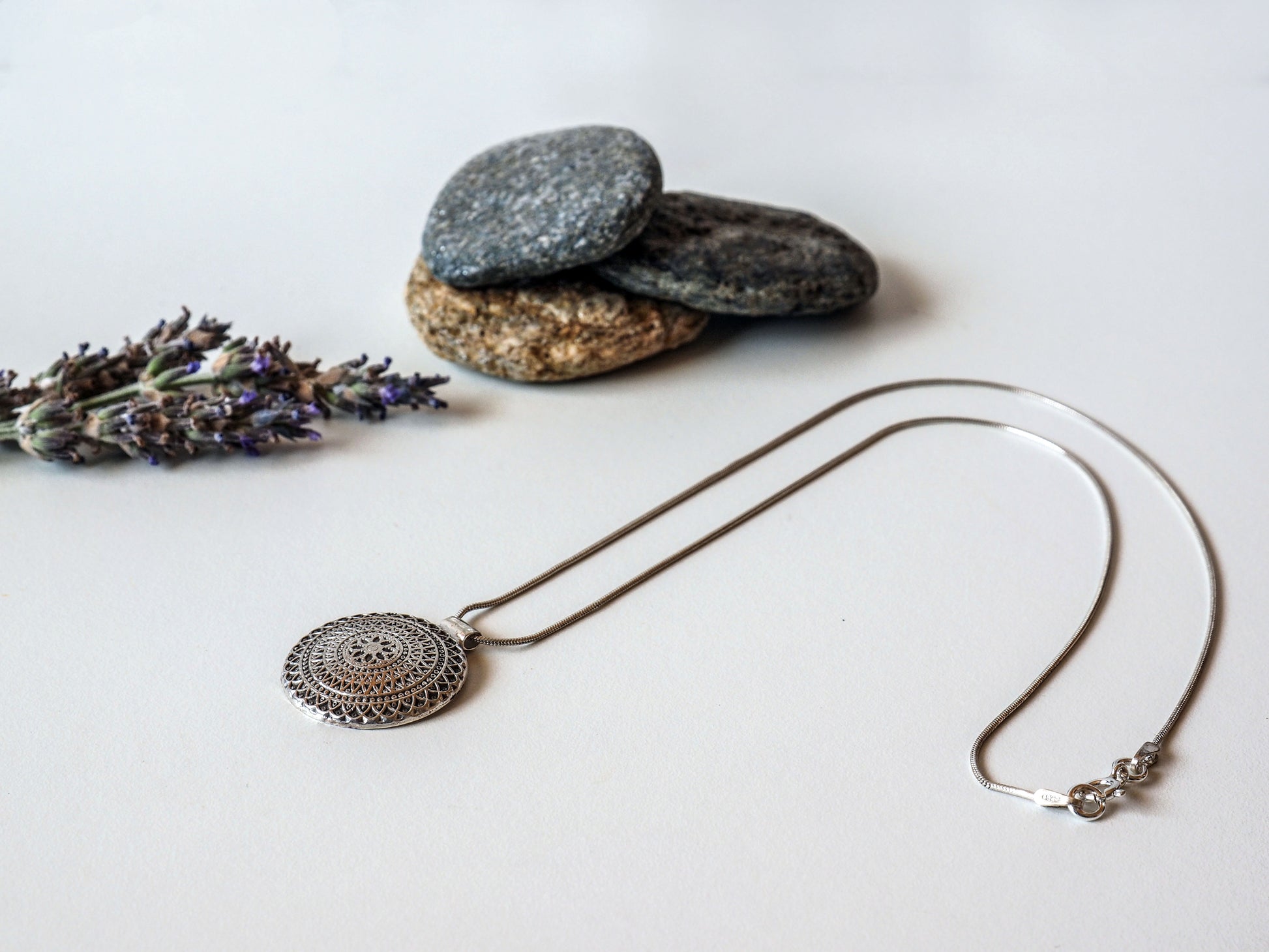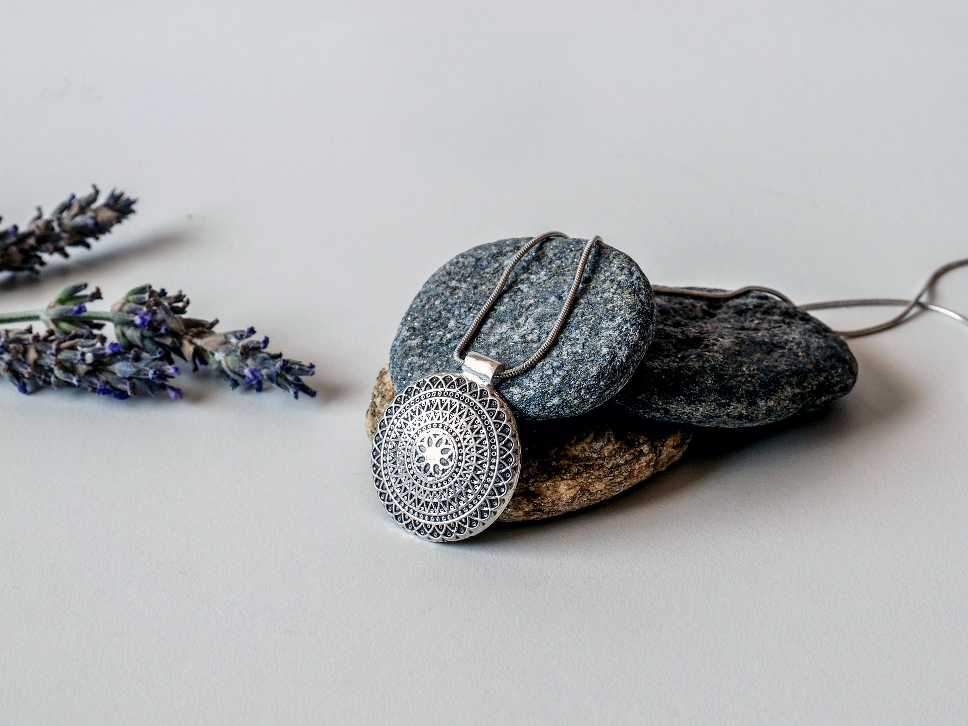 A pendant made with Silver 925 featuring a geometric mandala motif.