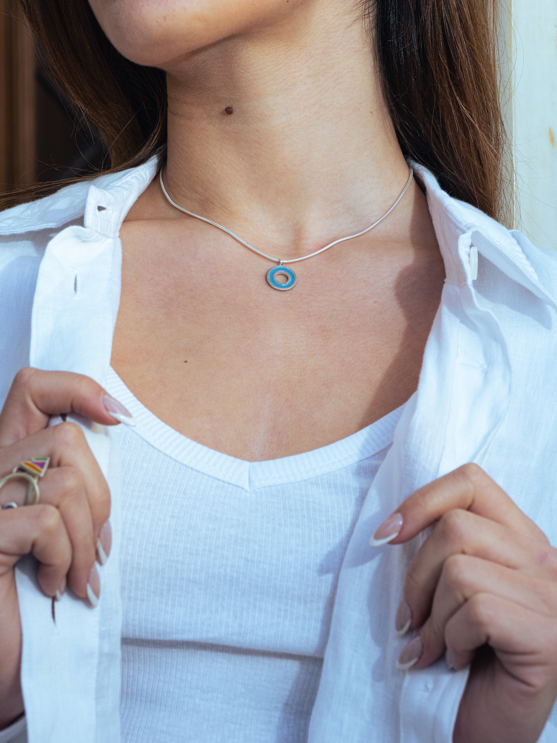 A handcrafted silver 925 minimalist pendant inspired by the purity of the circle and the quiet power of symmetry. Enriched with enamel in soft blue tones, the concentric form evokes balance, focus and inner harmony. A contemporary jewel that transforms minimal geometry into subtle wearable art.