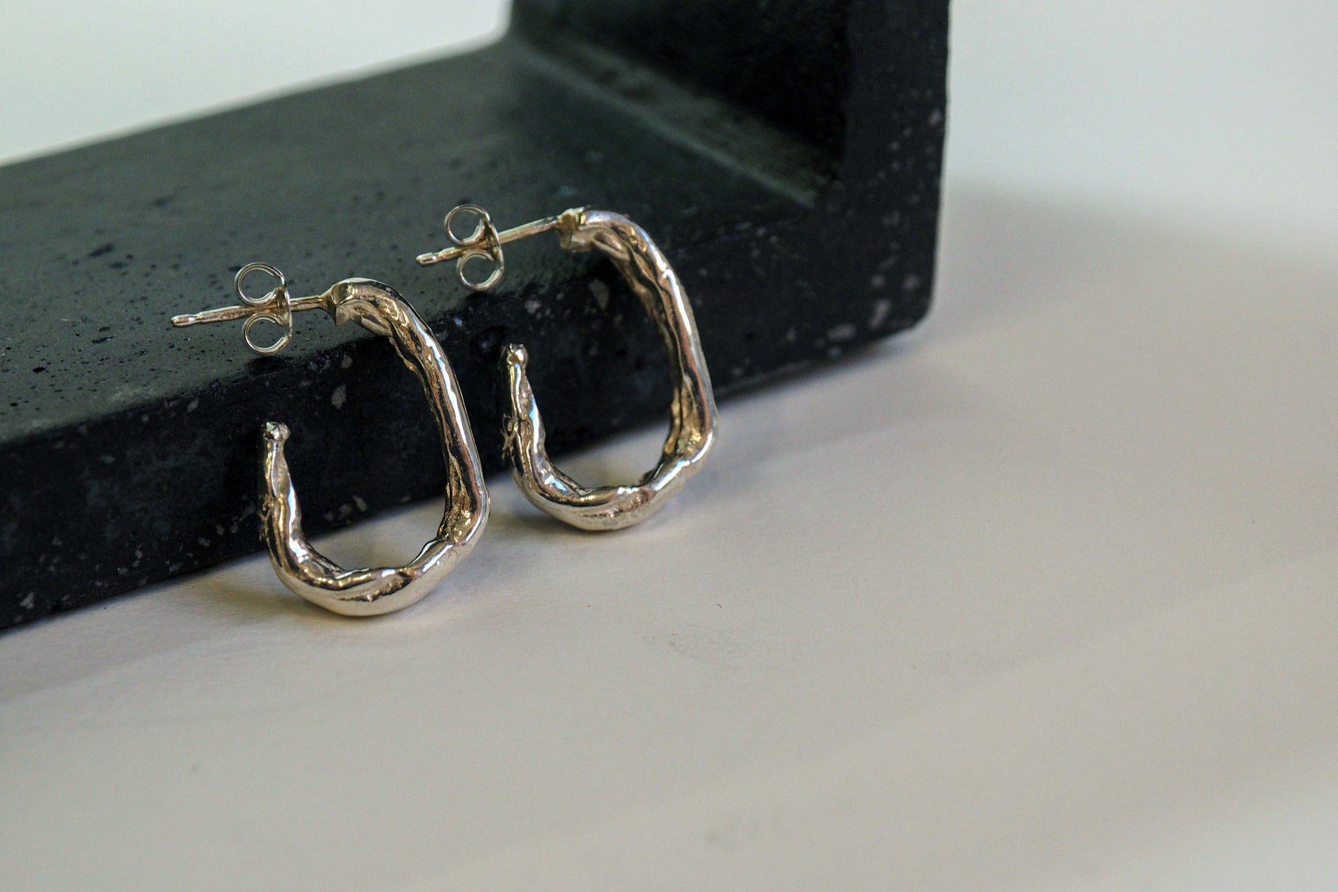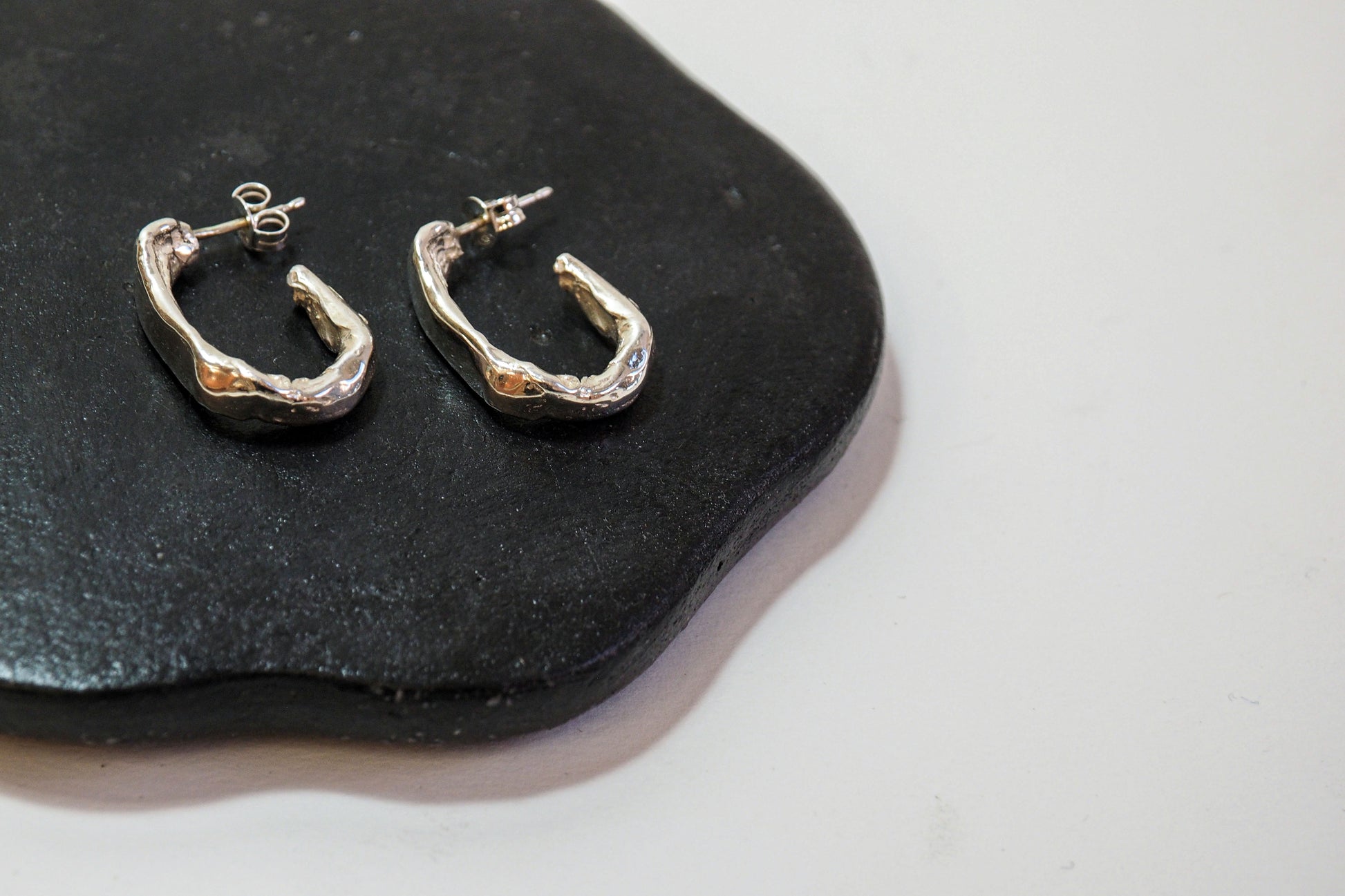 Molten earrings are designed as small sculptural forms rather than traditional hoops. Handcrafted with Silver 925 and intentionally irregular, they reflect the natural flow of melted metal.
