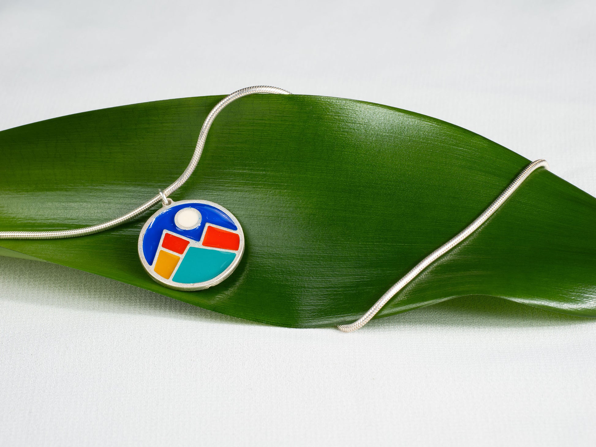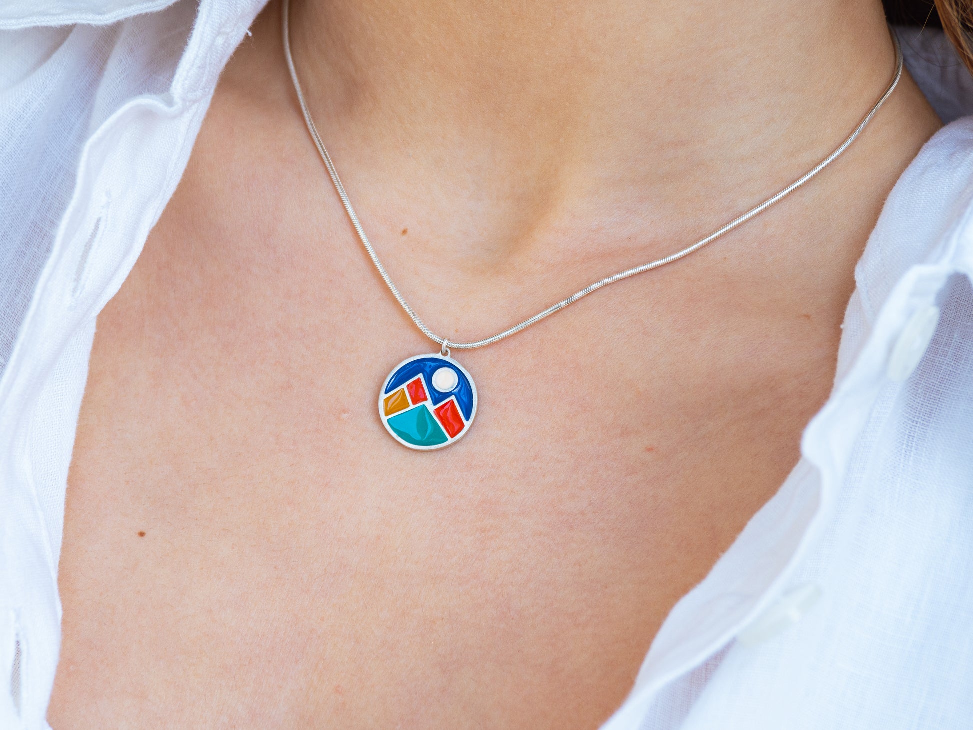 A handcrafted silver pendant inspired by the dialogue between mountains and sky. Enriched with enamel in vivid tones, the geometric composition transforms the landscape into a fragment of color and form, where peaks meet light and the sky becomes structure. A contemporary piece that reimagines nature through geometry, designed to express balance, depth and individuality.