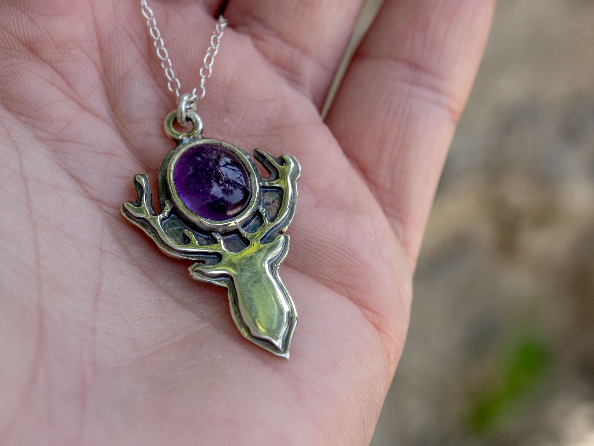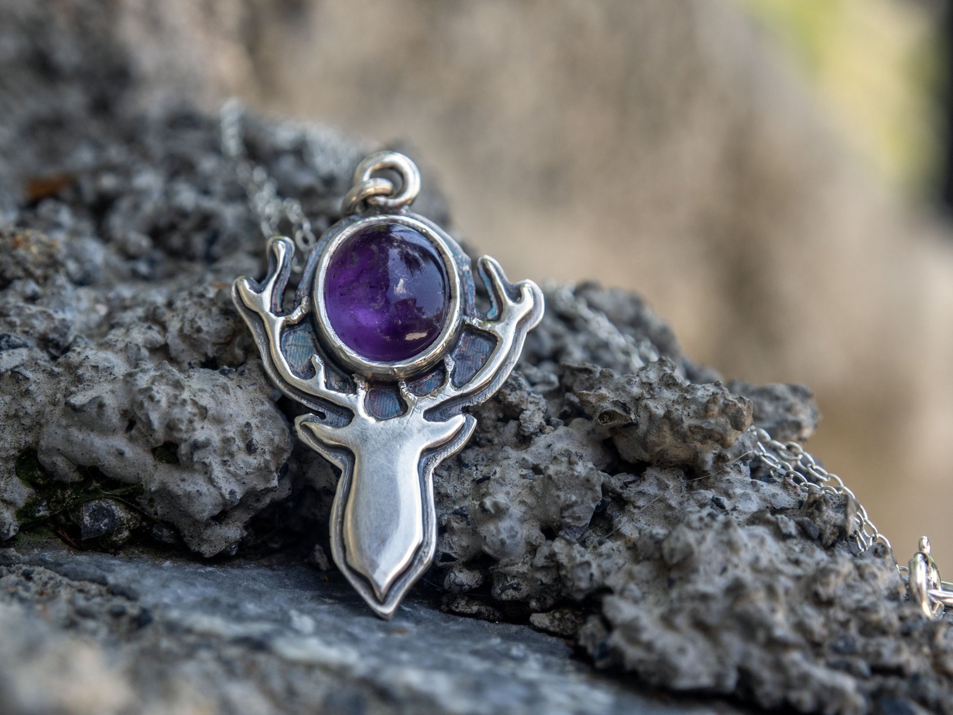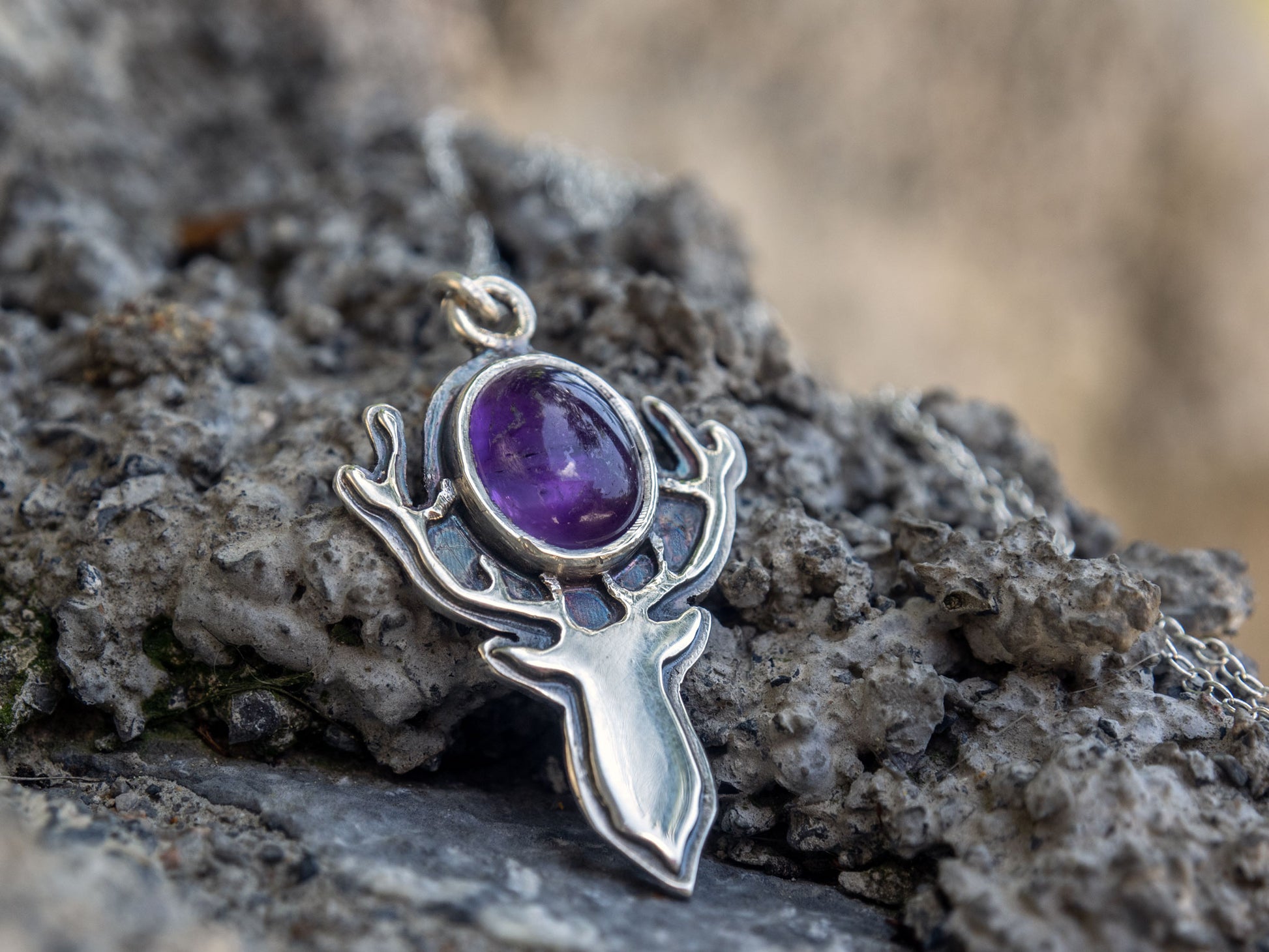 A one of a kind woodland pendant entirely made by hand with sterling silver. It features a handsawn deer sillouette with a beautiful Amethyst gemstone.