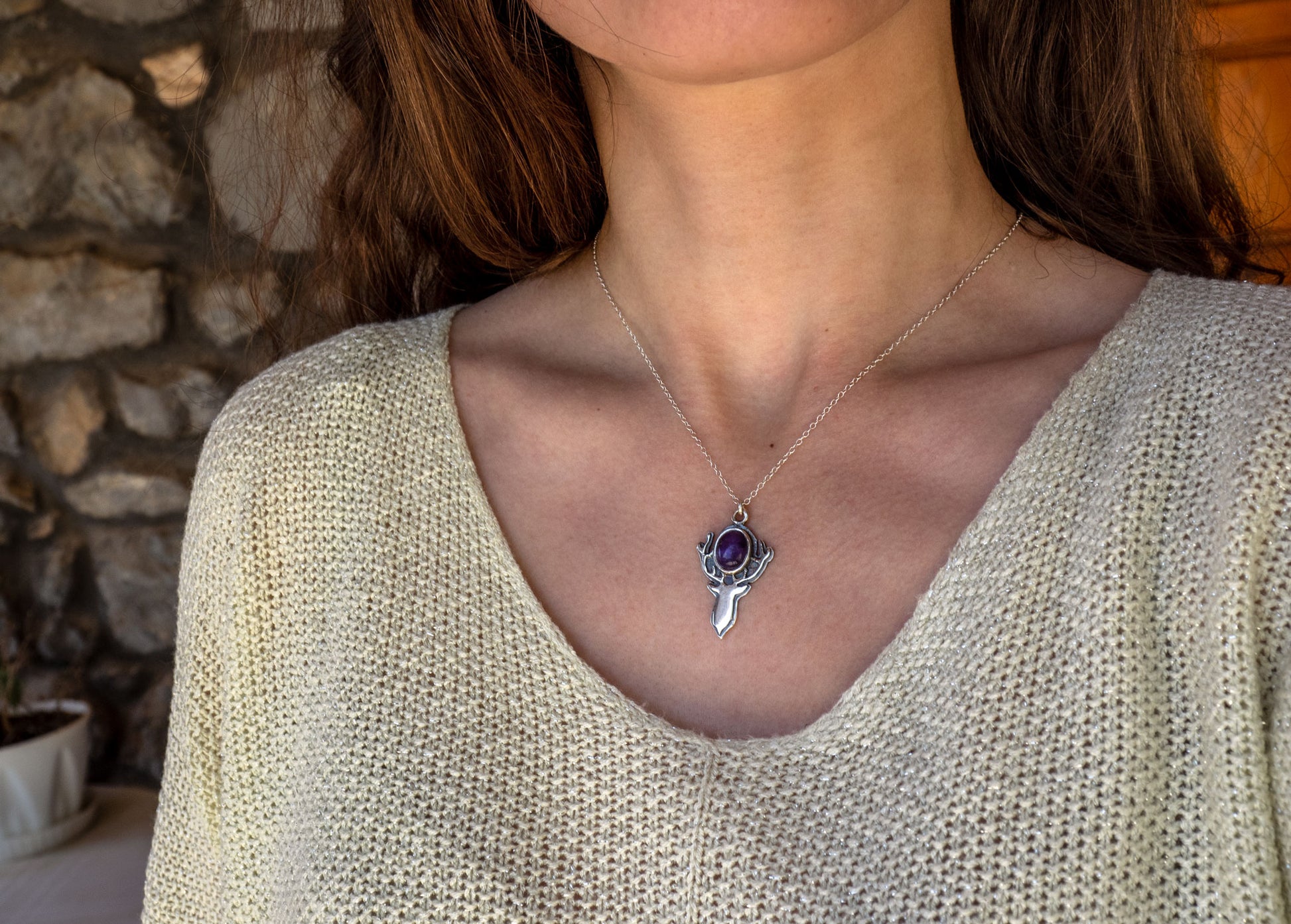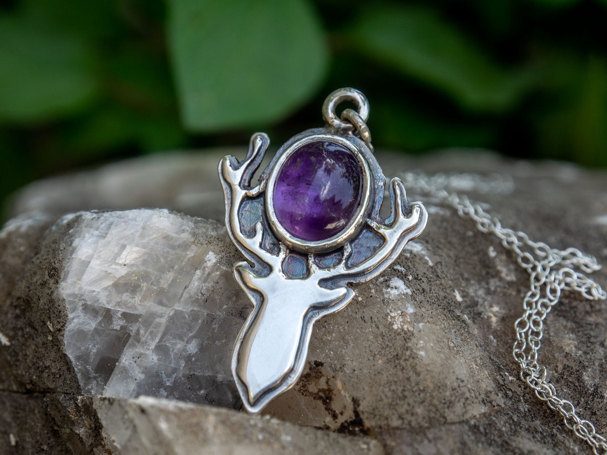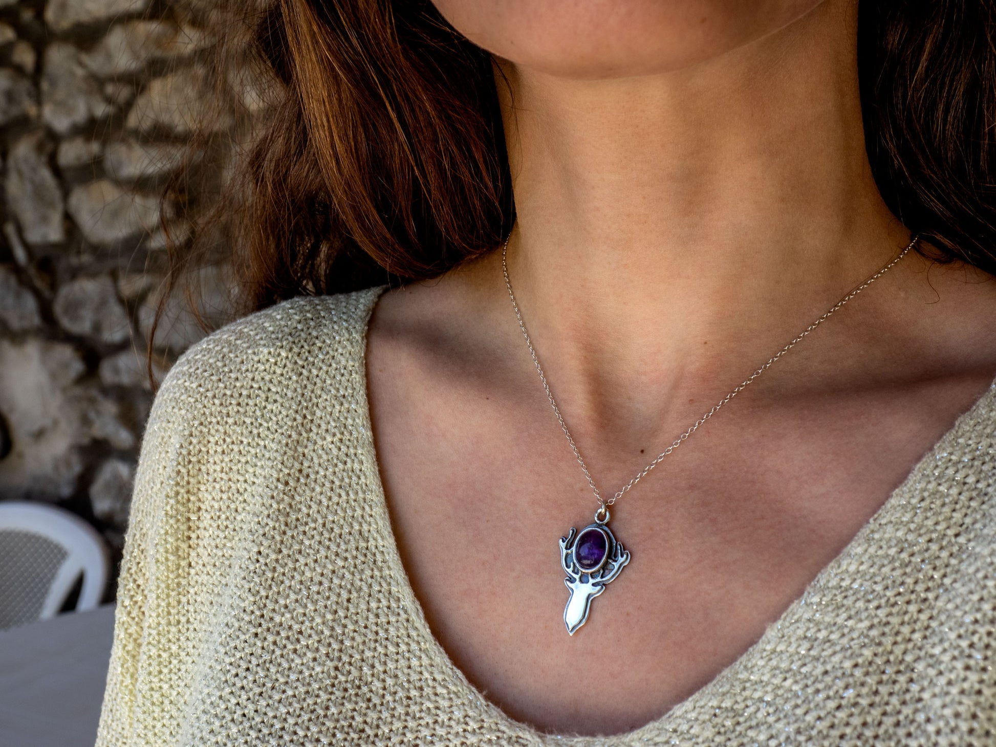 A one of a kind woodland pendant entirely made by hand with sterling silver. It features a handsawn deer sillouette with a beautiful Amethyst gemstone.